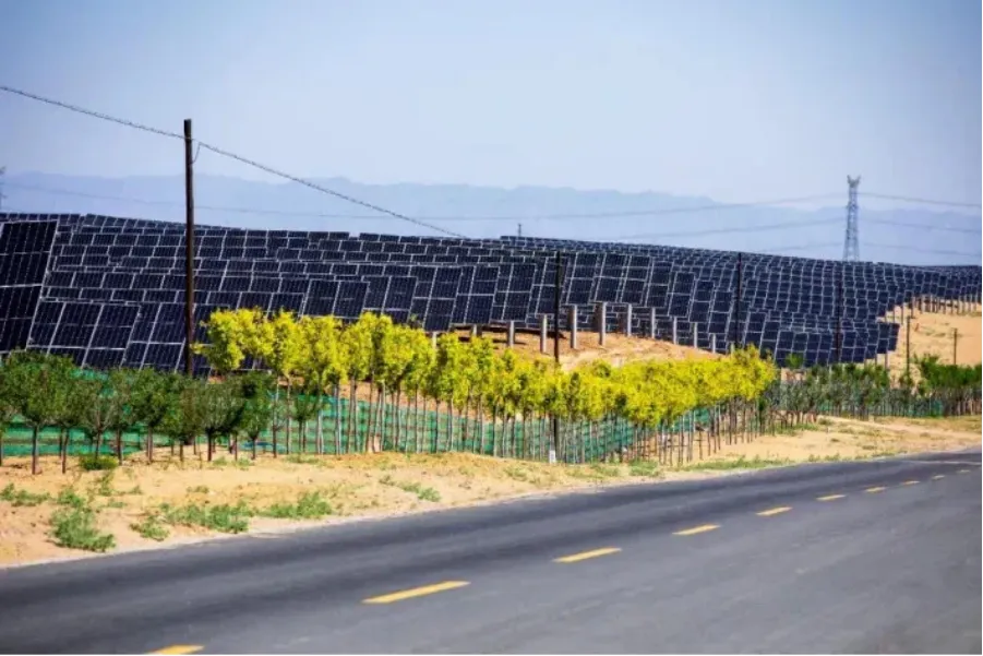 ▲?庫(kù)布其基地項(xiàng)目場(chǎng)區(qū)道路兩邊種植了防護(hù)林。?攝影:張博文