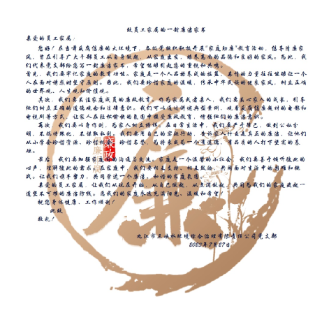 江西區(qū)域公司黨總支積極推進(jìn)廉潔文化陣地建設(shè),在辦公場(chǎng)所內(nèi)張貼廉潔文化宣傳海報(bào),組織員工開(kāi)展廉潔文化作品創(chuàng)作,開(kāi)展家庭助廉活動(dòng),通過(guò)向職工家屬發(fā)送廉潔家書(shū)、職工家屬向員工發(fā)送廉潔寄語(yǔ)等形式,積極打造廉潔從業(yè)“自律線”,不斷厚植企業(yè)廉潔文化土壤。