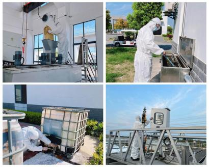 為確保作業(yè)人員的安全,公司以最高要求對廠區(qū)進(jìn)行消殺除菌,并要求工作人員全程穿著防護(hù)服。面對疫情來襲,長江環(huán)保人化身污水處理廠的“大白”,在看不見的戰(zhàn)場堅(jiān)守抗疫。