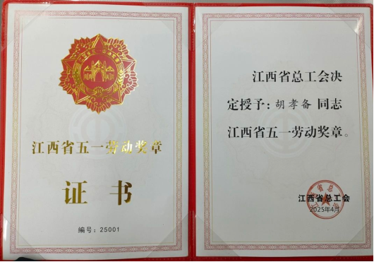 2025年5月16日,江西省總工會授予胡孝備“江西省五一勞動獎章”。